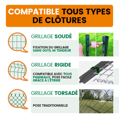 - grillage soudé : fixation sans outil ni tendeur grâce aux linguets, adaptés aux mailles 100×100, 100×75 et 100×50 mm.